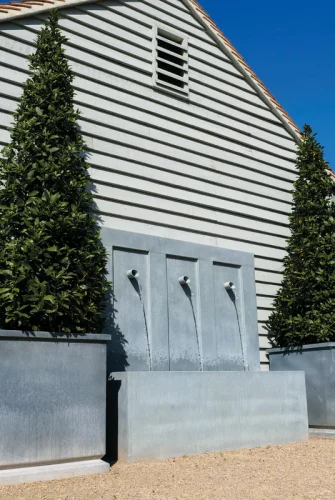 Die Brunnen und Wasserspiele der APG Kollektion werden aus Stahlplatten unterschiedlicher Stärken zu einem Stück verschweißt. Diese werden feuerverzinkt und mit einer Zink-Patina versehen. Zink setzt keinen Rost an und ist deshalb ein hervorragendes Material für den Brunnenbau. Das Grau in Grau Farbspiel der Patina galt schon in der Antike als sehr dekorativ und feiert in der Moderne ein großes Comeback.