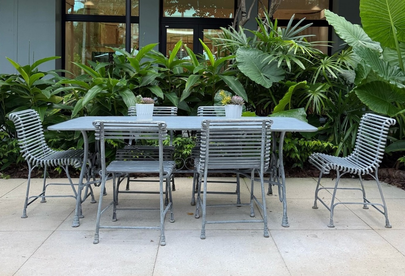 Stahlprofilrohre und Stahlbänder werden für den Stuhl gebogen und zu einem Stück verschweißt, sowie vernietet. Ein Großteil der Arbeit erfolgt per Hand. So auch das Feuerverzinken. In einem Bad aus geschmolzenem Zink bekommt der Gartenstuhl die APG typische Patina in Grau, die mit der Zeit heller werden wird. Der Metallstuhl wiegt elf Kilogramm. Dieser ist die optimale Ergänzung zum Dining Table und zum Bistro Table der Marke A Place in the Garden (APG).