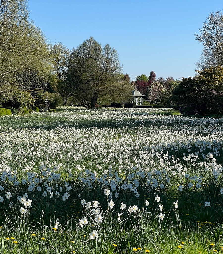 Narzissenwiese im Arboretum Ellerhoop im Hintergrund mit Pavillon Wallingford von Classic Garden Elements