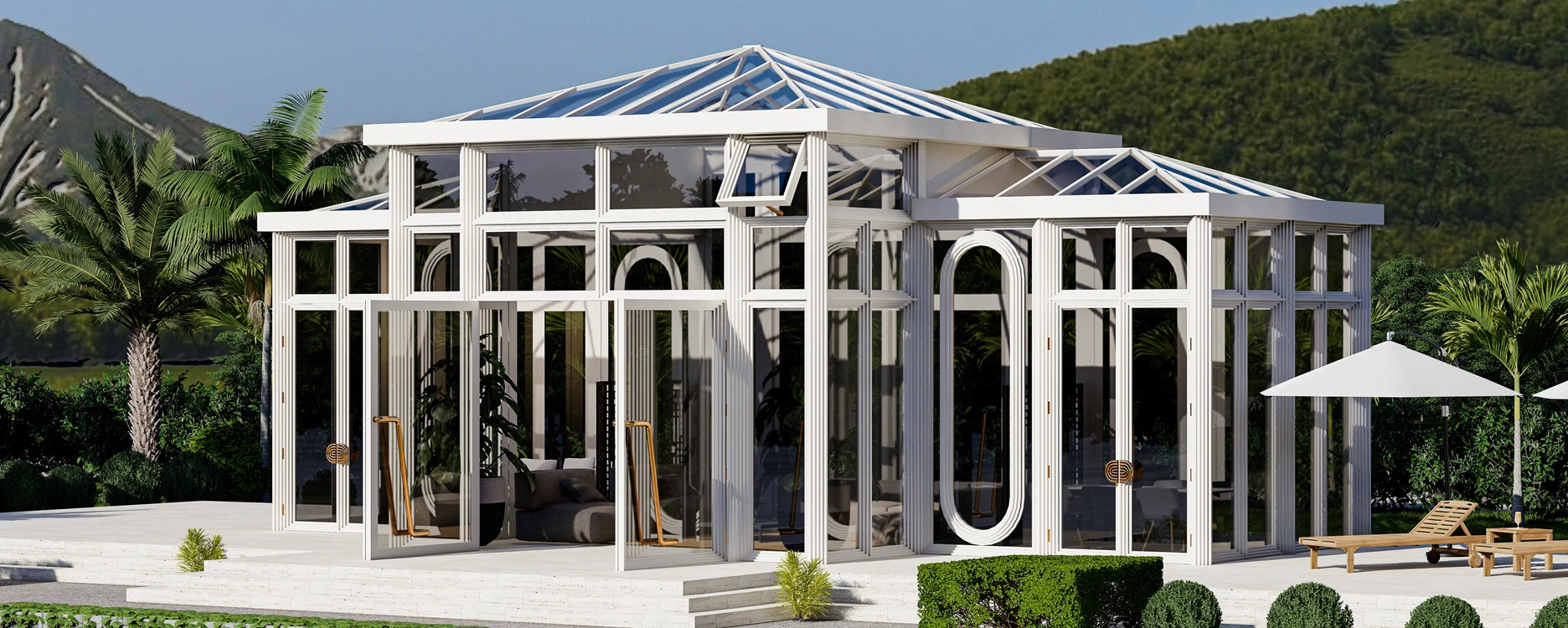 Alle Glasflächen des Wohnwintergartens bestehen aus Doppelverglasung für optimale Wärmeisolierung. Elektrisch steuerbare Dachfenster ermöglichen eine einfache Belüftung. Türgriffe und Scharniere bestehen aus massivem Messing, um den Anforderungen einer maritimen Umgebung gerecht zu werden. Die Maße des beispielhaft abgebildeten GLARUS Strandhauses betragen 14 Meter in der Gesamtlänge, 6,4 Meter in der Breite und 6 Meter in der Höhe.