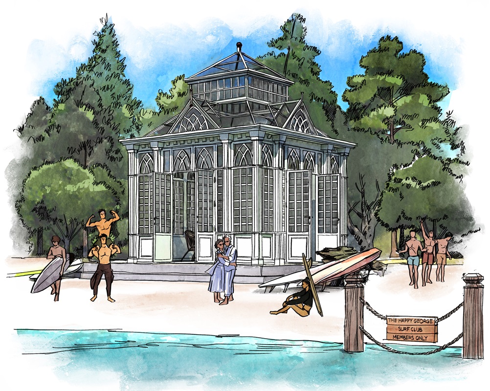 Das HAPPY GEORGE Strandhaus kombiniert viktorianisch inspiriertes Design mit modernen Materialien und Verarbeitungstechniken. Die imposant gestaffelte Dachkonstruktion besteht aus vier kleineren verglasten Spitzgiebeln und einer großen viereckigen ebenfalls vollverglasten Dachlaterne.
