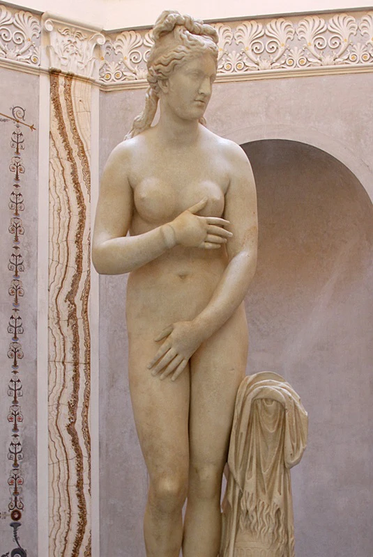 Die Kapitolinische Venus, entdeckt um 1667–1670 in den Gärten der Familie Stazi in der Nähe der Basilika San Vitale in Rom, wurde 1752 von Papst Benedikt XIV. erworben. Dieser schenkte die Statue den Kapitolinischen Museen. Während der napoleonischen Ära befand sich die Statue von 1797 bis 1815 in Paris. Seit ihrer Rückkehr wird sie im „Gabinetto della Venere“ des Palazzo Nuovo ausgestellt. Die hochberühmte Venusdarstellung aus Marmor datiert aus dem 2. Jahrhundert vor Christus. Die kapitolinische Venus ist ein Typus der Venusstatue, und zwar einer von mehreren Venus-Pudica-Typen (andere sind die Venus de’ Medici), von denen mehrere Exemplare existieren. Der Typus leitet sich letztlich von der Aphrodite von Knidos ab, geschaffen von Praxiteles. Die kapitolinische Venus und ihre Varianten sind an der Haltung der Arme zu erkennen: Nach dem Bad aufstehend, bedeckt Venus mit der rechten Hand ihre Brüste und mit der linken Hand ihre Leisten. Die Bronze-Nachguss-Statue, die Sie in unserem Online Shop kaufen können, wird in Museumsqualität gefertigt. Kaufen Sie das antike Replikat, um Ihre persönliche oder eine öffentlich zugängliche Statuen-Sammlung zu erweitern. Über die Sockelgravur lässt sich die Bronze-Nachguss-Statue individualisieren.