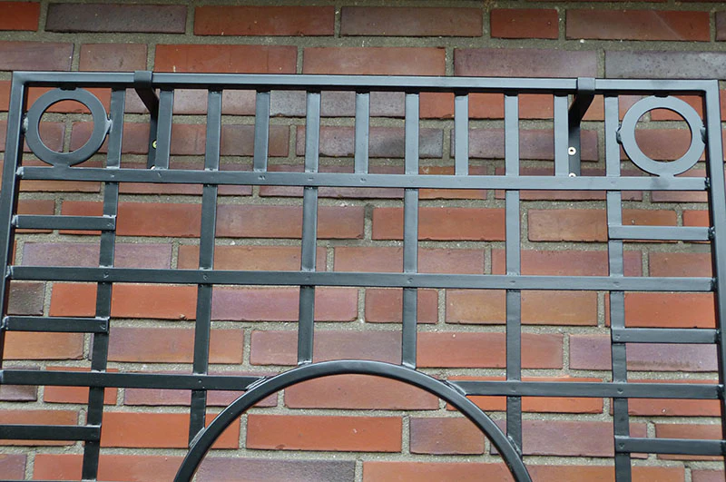 Der englische Landsitz Knebworth House in der Grafschaft Hertfordshire stand Pate für das elegante Wandgitter. Er repräsentiert den exotisch verspielten neugotischen Stil, der für das Spalier aus Schmiedeeisen übernommen wurde. Im rechteckigen Format mit einer Höhe von 200 Zentimeter und einer Breite von 100 Zentimeter schwebt das Knebworth House Wandgitter unübersehbar an der Mauer. Das quadratische Rankgitter wird unterbrochen durch einen großen kreisrunden Ausschnitt im oberen Drittel des Gitters. Das Element des Kreises sorgt zusätzlich an den vier Ecken des Spaliers für Auflockerung. Teilberankt oder komplett eingenommen von Rosen, Clematis oder der Schwarzäugigen Susanne wird das Rankgitter zu einem blühenden Wandbild. Für die großflächige Fassadenbegrünung werden mehrere Metall Rankgitter Knebworth House kombiniert.