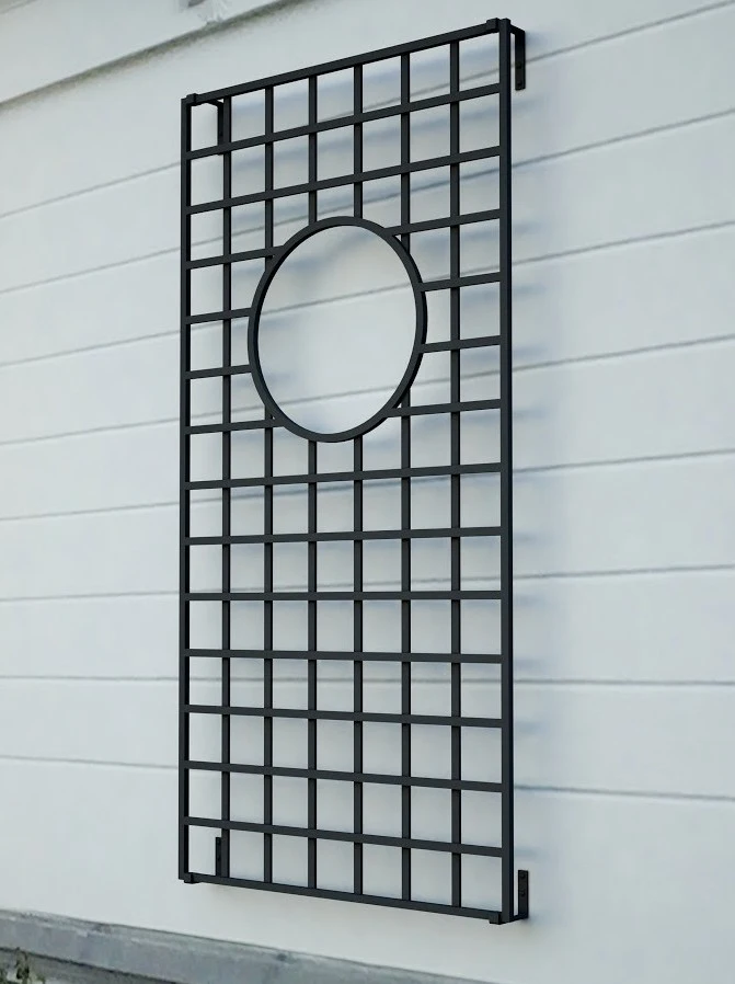 Das rechteckige Rankgitter aus Schmiedeeisen kann horizontal oder vertikal an der Fassade angebracht werden. Es bildet stets einen gelungenen Blickfang und ist ein zuverlässiger Partner für alle Kletterpflanzen. Der kreisförmige Ausschnitt lockert den schlichten Bauhaus Stil des Rankgitter auf. Sowohl in Gesellschaft mit Rosen, Efeu oder Wildem Wein als auch als Solist verspricht der Kreisausschnitt einen besonderen Gestaltungseffekt. Das klassische Design des rechteckigen Rankgitter harmoniert so gut wie zu jeder Architektur. Es wirkt einzeln, im Duo, Trio oder Quartett. Je nachdem wie viel Platz zur Verfügung steht, können Sie beliebig viele der rechteckigen Metall Rankgitter Lamport Hall kombinieren. Langweiligen, optisch vernachlässigten Wänden, zum Beispiel Einfahrten in Tiefgaragen wird hier Form und Struktur gegeben. Im Online Shop gibt es auch schmale Rankgitter im Bauhaus Stil zu kaufen, die das Design Lamport Hall stilvoll ergänzen.