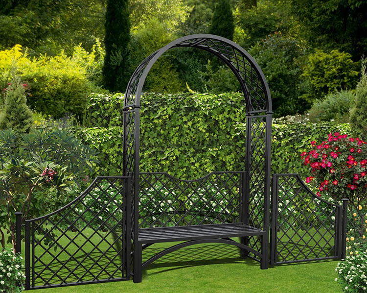 Verarbeitung Metall Rosenbogen Portofino mit Gartenbank und 110 cm hohem Zaun