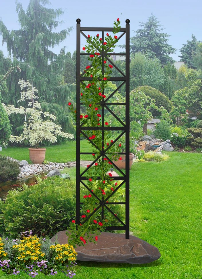 Als Rankhilfe für Clematis, als Kletterhilfe für Rosen oder als Kunstwerk im Garten bezaubert der Schmiedeeisen Rankobelisk. Designprägend für die Ravenna Serie ist das lebendige Spiel der Geometrien aus der Römerzeit. Die Form des Quadrats präsentiert sich mit den vielen Querstreben sehr kraftvoll. Aus einem großen Quadrat werden vier kleine Quadrate, die sich wiederum in acht Dreiecke aufteilen. Dieses Spiel der Formen wiederholt sich viermal und gewinnt damit eine sehr interessante Dynamik. Passend zum Schmiedeeisen Rankobelisk Ravenna gibt es aus dieser Designlinie auch das Metallspalier Ravenna zur Wandmontage zu kaufen. Mit einer Breite von 60 Zentimeter und einer Tiefe von vier Zentimeter nimmt der Schmiedeeisen Rankobelisk nicht viel Platz ein. Trotzdem ist dieser ein Garant für imposante Effekte im Garten. Schaffen Sie eine neue Blickachse im Garten, bereichern Sie eine Blumenrabatte oder verschönern Sie den Vorgarten. Der Schmiedeeisen Rankobelisk ist sehr stabil und massiv. Mit einem Eigengewicht von 36 Kilogramm ist er auch für große Blütendolden ein stabiler Partner.