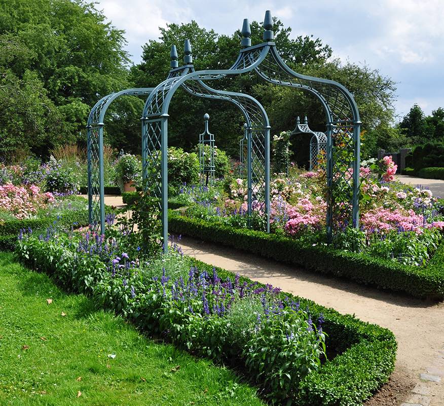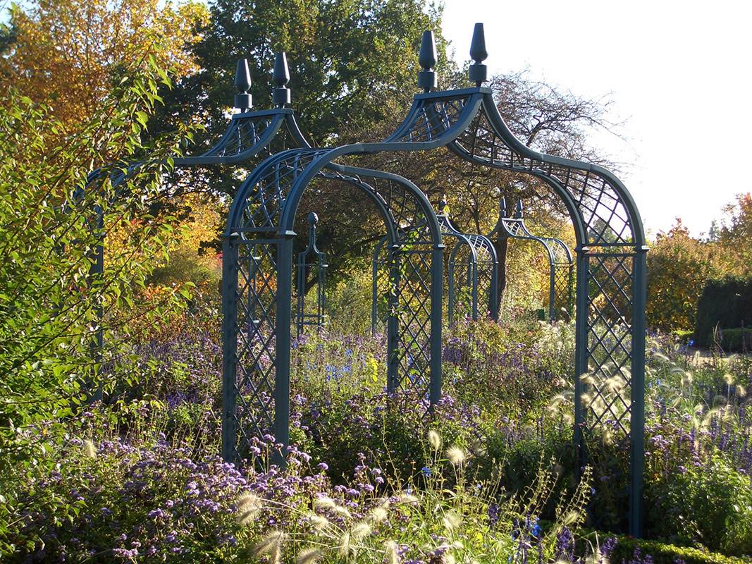Very british soll er sein! Zurückhaltend elegant, formvollendet gediegen, eine Mischung aus Tradition und Moderne. Das Rautengeflecht des viktorianischen Rosenbogens erinnert an populäre Karomuster britischer Stoffe. Ein doppelter Rahmen verstärkt perfekte Linien und Proportionen. Beinahe schade, diesen grundsoliden Rosenbogen aus Metall unter bunten Pflanzenkleidern zeitweise verschwinden zu lassen. Dafür ist der Brighton im Winter in Weiß ein Eyecatcher schlechthin.